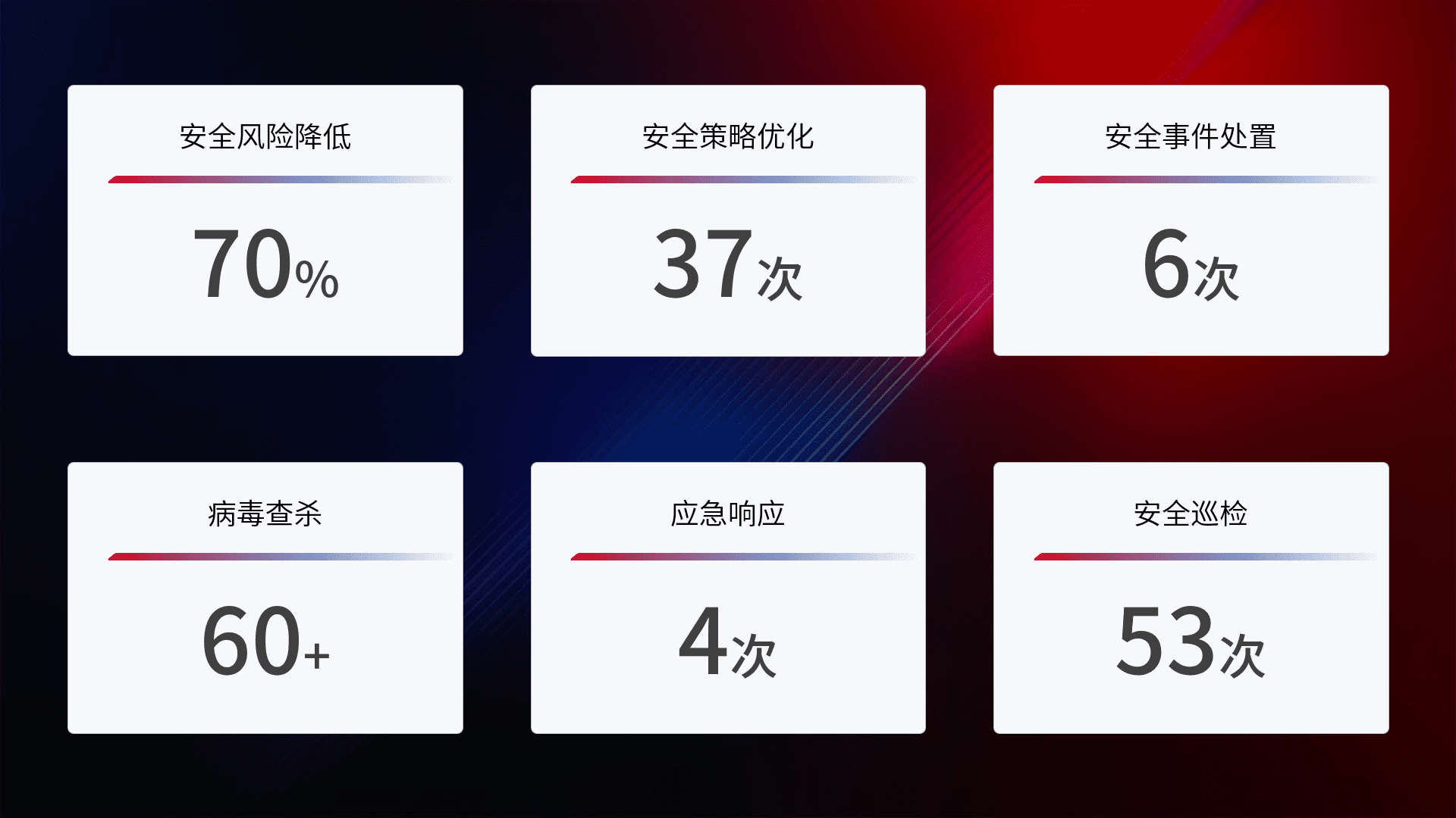 提供全面的安全事件报告体系,,,包括处置报告、、周报、、季度和年度总结,,,结合持续监控,,帮助客户深入了解网络安全状况。。。。